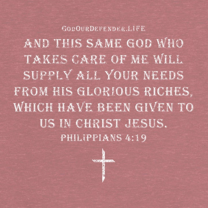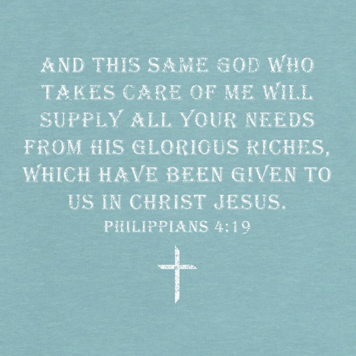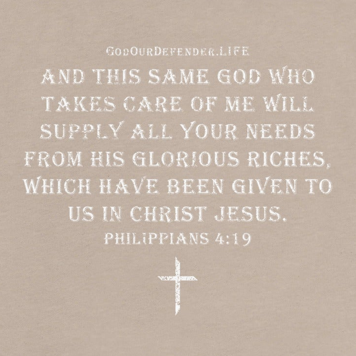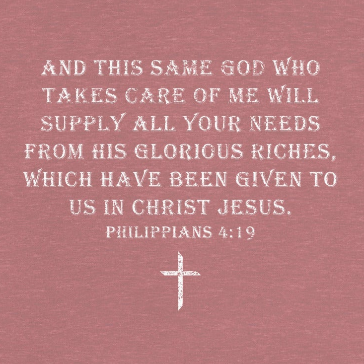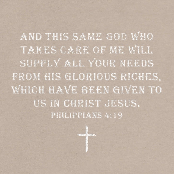 "And this same God who takes care of me will supply all your needs from his glorious riches, which have been given to us in Christ Jesus." - Philippians 4:19